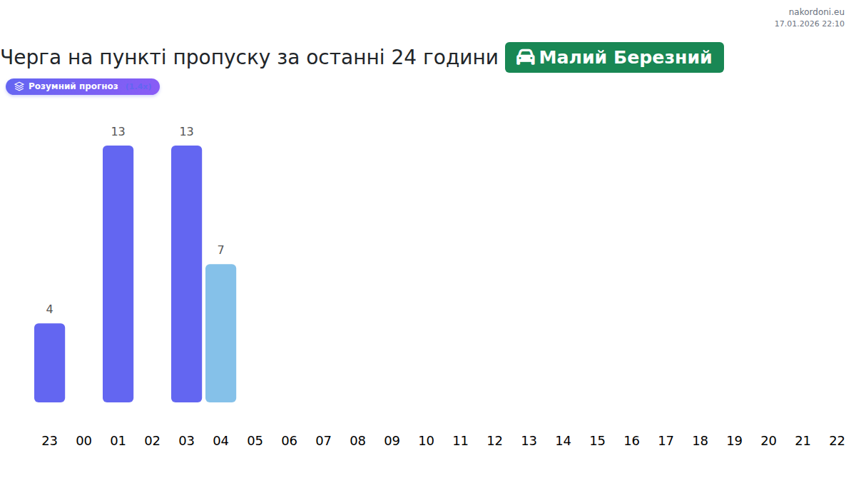 Для уникнення довгих черг на кордоні на пункті пропуску Малий Березний - легковий автомобіль, рекомендуємо планувати перетин кордону в години найменшого навантаження. Згідно з даними за минулу добу, найменша кількість автомобілів спостерігалася між 5:00 та 9:00 годинами. Це ідеальний час для перетину кордону, щоб зекономити час і уникнути затримок.