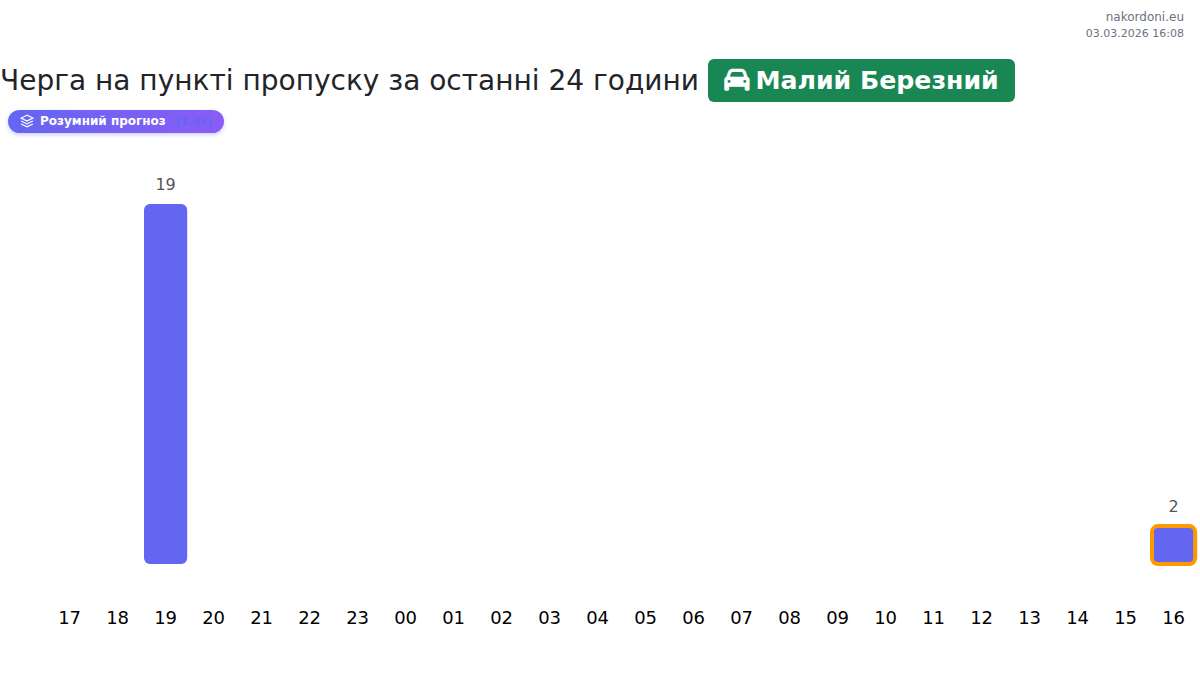 На пункті «Малий Березний» час очікування коливається від 15 до 117 хвилин. Уникайте пікових годин: 20:00, 01:00 та 17:00. Найкращий час для перетину кордону — 09:00, 12:00 та 15:00.