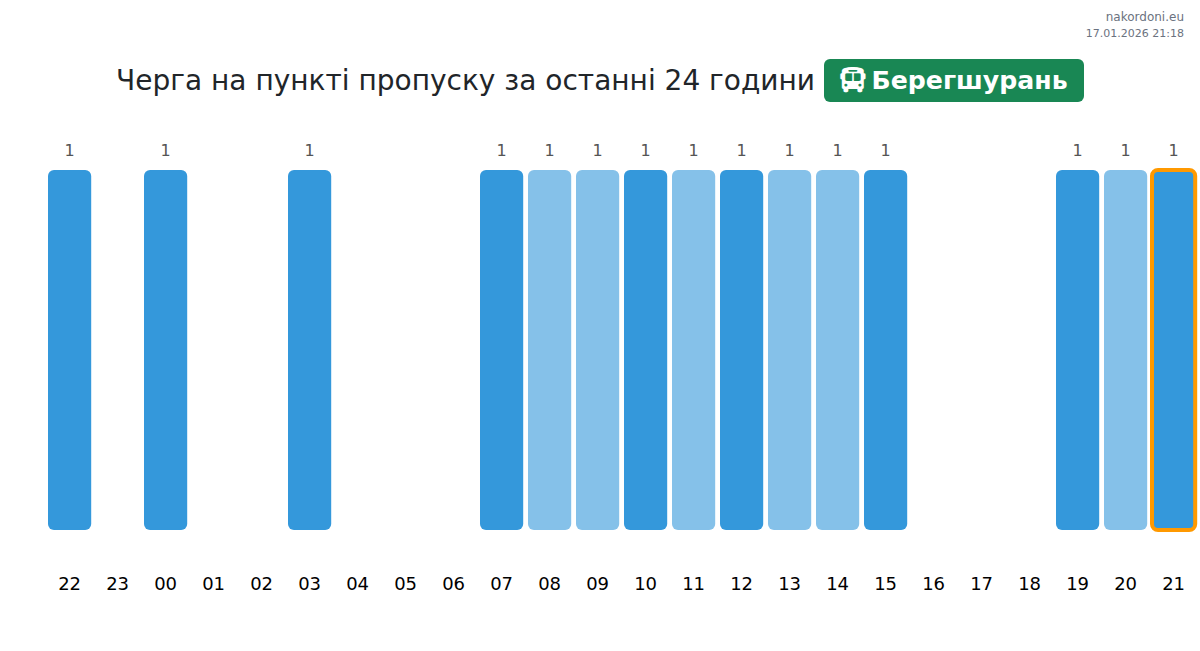 Очікуваний час очікування для автобусів на КПП Берегшурань становить 15-75 хвилин. Рекомендуємо уникати годин пік о 14:00, 19:00 та 22:00. Найкращий час для швидкого перетину кордону — 23:00, 00:00 або 01:00.
