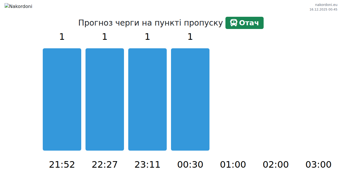 Для уникнення довгих черг на кордоні на пункті пропуску Отач - автобус, рекомендуємо планувати перетин кордону в години найменшого навантаження. Згідно з даними за минулу добу, найменша кількість автомобілів спостерігалася між 7:00 та 11:00 годинами. Це ідеальний час для перетину кордону, щоб зекономити час і уникнути затримок.
