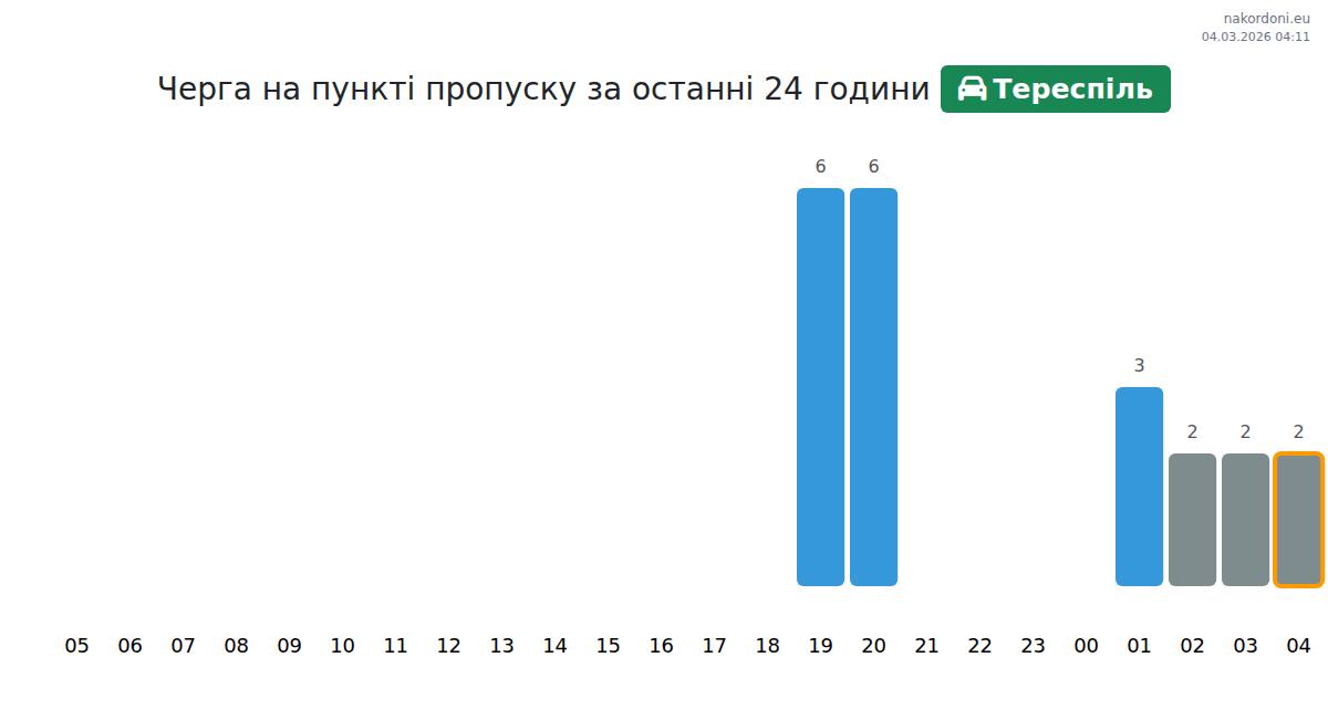 Для уникнення довгих черг на кордоні на пункті пропуску Тереспіль - легковий автомобіль, рекомендуємо планувати перетин кордону в години найменшого навантаження. Згідно з даними за минулу добу, найменша кількість автомобілів спостерігалася між 1:00 та 4:00 годинами. Це ідеальний час для перетину кордону, щоб зекономити час і уникнути затримок.