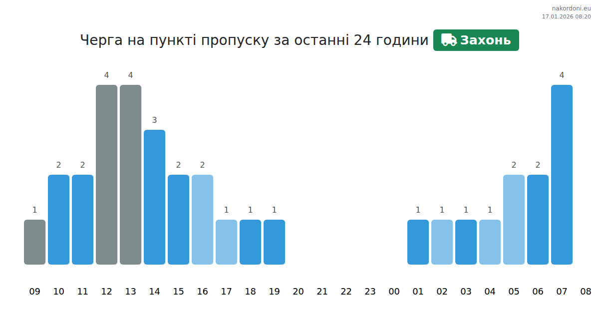 Для уникнення довгих черг на кордоні на пункті пропуску Захонь - вантажний транспорт, рекомендуємо планувати перетин кордону в години найменшого навантаження. Згідно з даними за минулу добу, найменша кількість автомобілів спостерігалася між 15:00 та 18:00 годинами. Це ідеальний час для перетину кордону, щоб зекономити час і уникнути затримок.