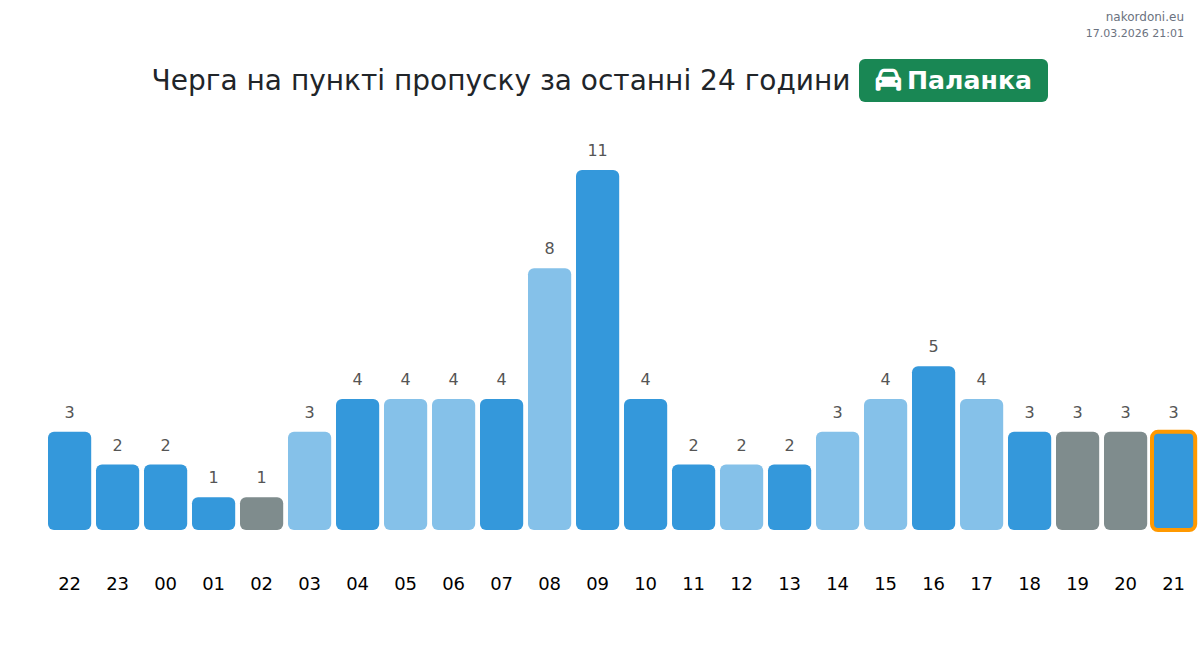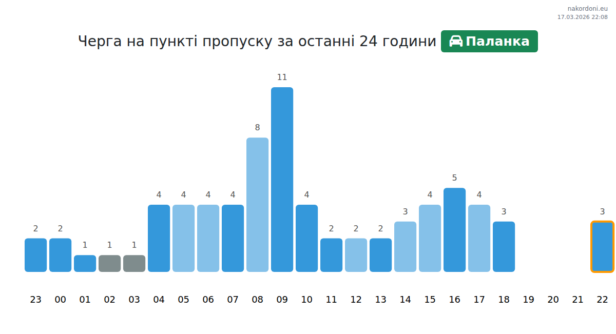 Для уникнення довгих черг на кордоні на пункті пропуску Паланка - легковий автомобіль, рекомендуємо планувати перетин кордону в години найменшого навантаження. Згідно з даними за минулу добу, найменша кількість автомобілів спостерігалася між 3:00 та 4:00 годинами. Це ідеальний час для перетину кордону, щоб зекономити час і уникнути затримок.