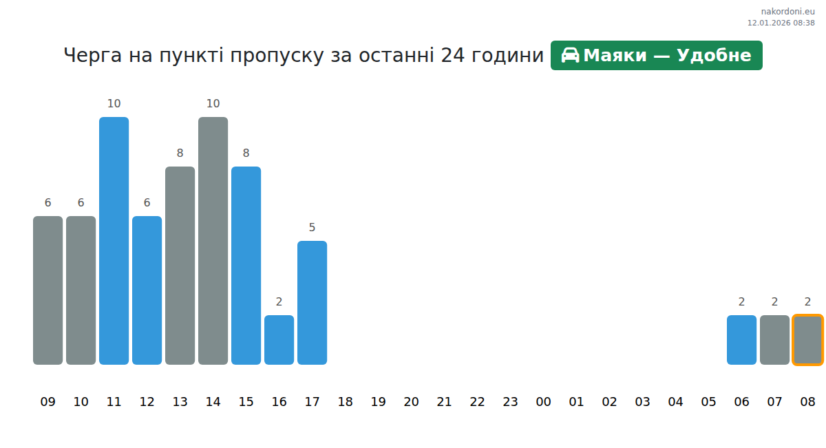 Для уникнення довгих черг на кордоні на пункті пропуску Маяки — Удобне - легковий автомобіль, рекомендуємо планувати перетин кордону в години найменшого навантаження. Згідно з даними за минулу добу, найменша кількість автомобілів спостерігалася між 5:00 та 16:00 годинами. Це ідеальний час для перетину кордону, щоб зекономити час і уникнути затримок.