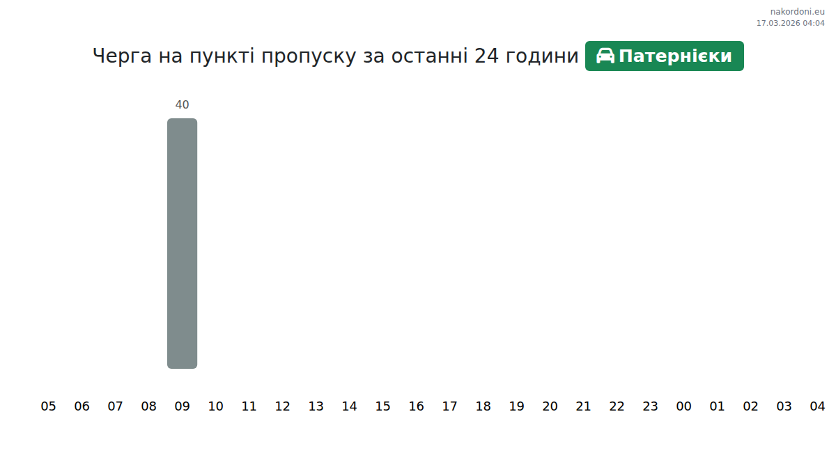 На пункті Патернієки час очікування для легкових авто становить від 15 до 415 хвилин. Уникайте пікових годин о 13:00, 14:00 та 07:00, щоб не стояти в черзі. Найкращий час для перетину кордону — 15:00, 16:00 та 17:00.