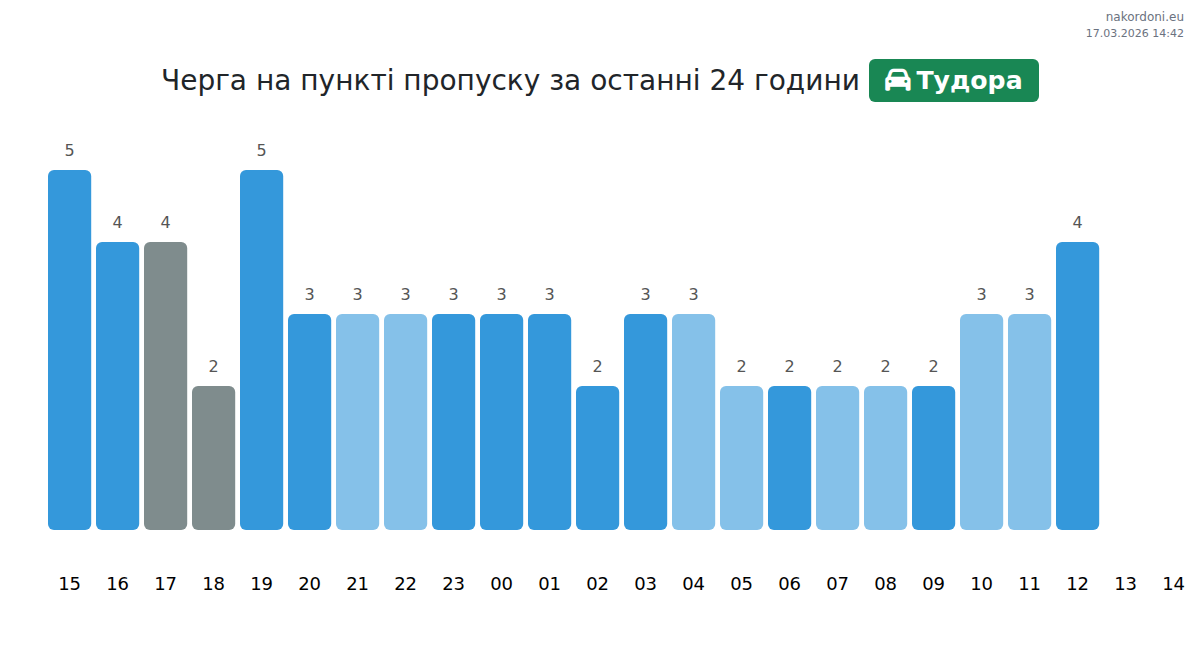 Оновлення для Тудора: очікування до кінця дня становить 25–65 хвилин для легкових авто. Найбільше навантаження очікується о 12:00, 13:00, 07:00. Рекомендовані години для перетину: 01:00, 16:00, 17:00. Прогноз базується на актуальних даних та денному профілі.