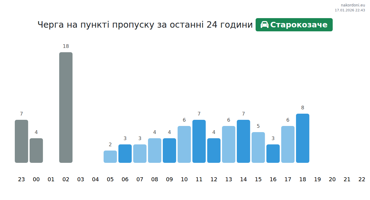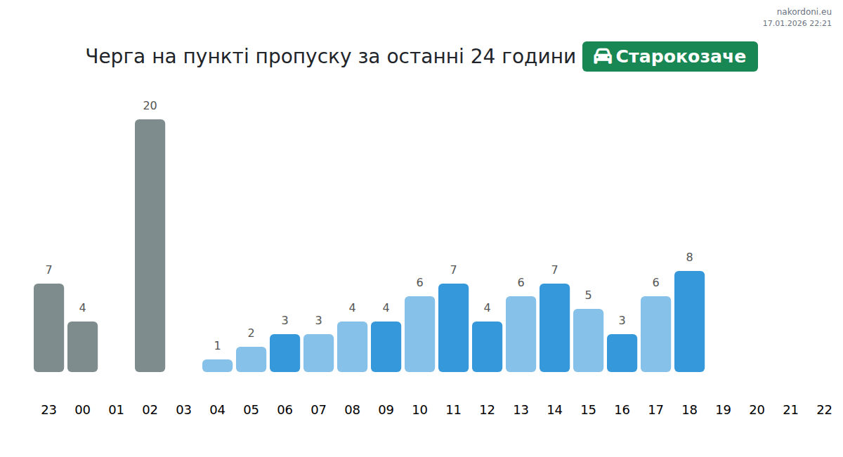 Для уникнення довгих черг на кордоні на пункті пропуску Старокозаче - легковий автомобіль, рекомендуємо планувати перетин кордону в години найменшого навантаження. Згідно з даними за минулу добу, найменша кількість автомобілів спостерігалася між 14:00 та 20:00 годинами. Це ідеальний час для перетину кордону, щоб зекономити час і уникнути затримок.