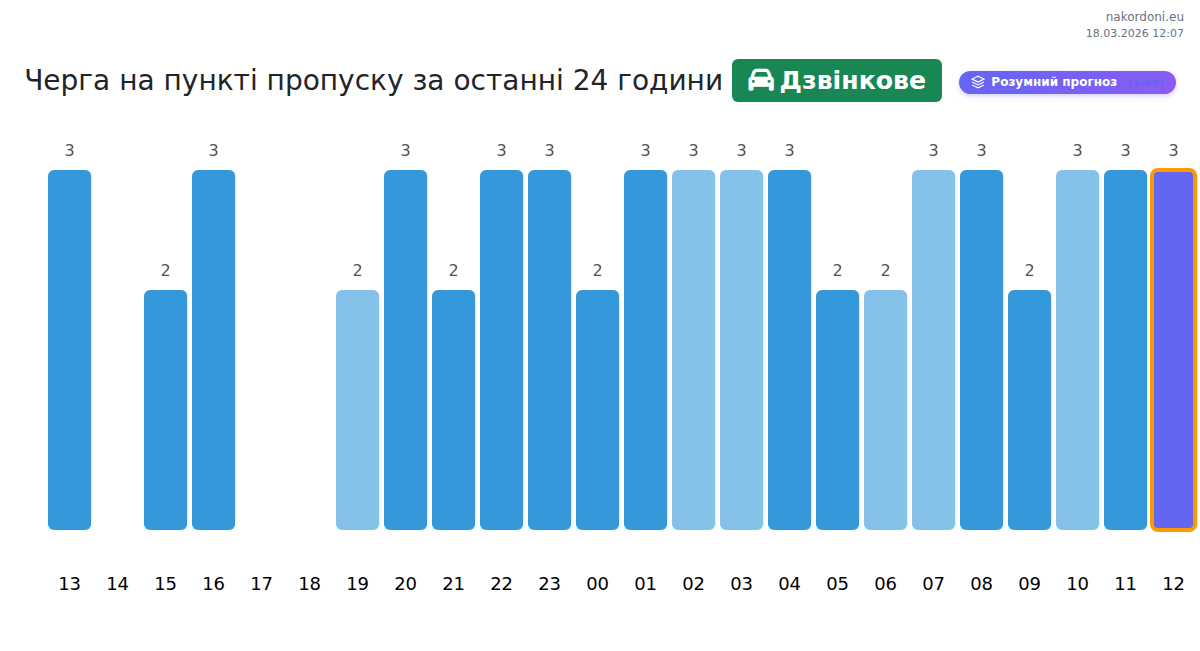 Для уникнення довгих черг на кордоні на пункті пропуску Дзвінкове - авто, рекомендуємо планувати перетин кордону в години найменшого навантаження. Згідно з даними за минулу добу, найменша кількість автомобілів спостерігалася між :00 та 18:00 годинами. Це ідеальний час для перетину кордону, щоб зекономити час і уникнути затримок.
