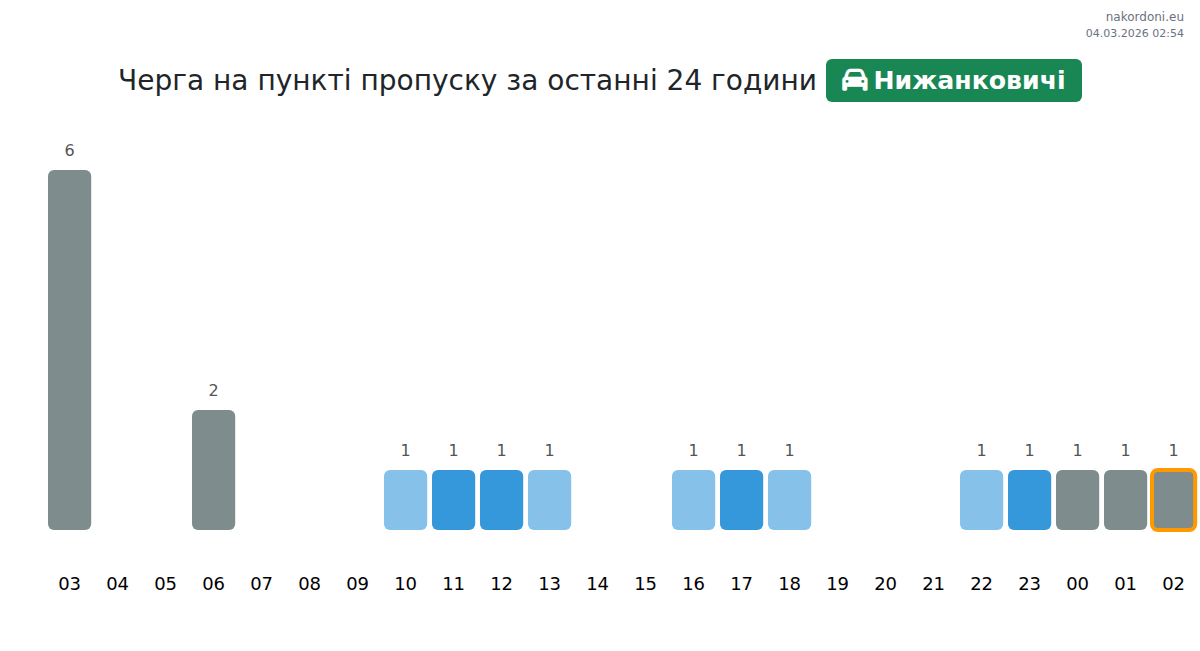 Для уникнення довгих черг на кордоні на пункті пропуску Нижанковичі - легковий автомобіль, рекомендуємо планувати перетин кордону в години найменшого навантаження. Згідно з даними за минулу добу, найменша кількість автомобілів спостерігалася між :00 та 5:00 годинами. Це ідеальний час для перетину кордону, щоб зекономити час і уникнути затримок.