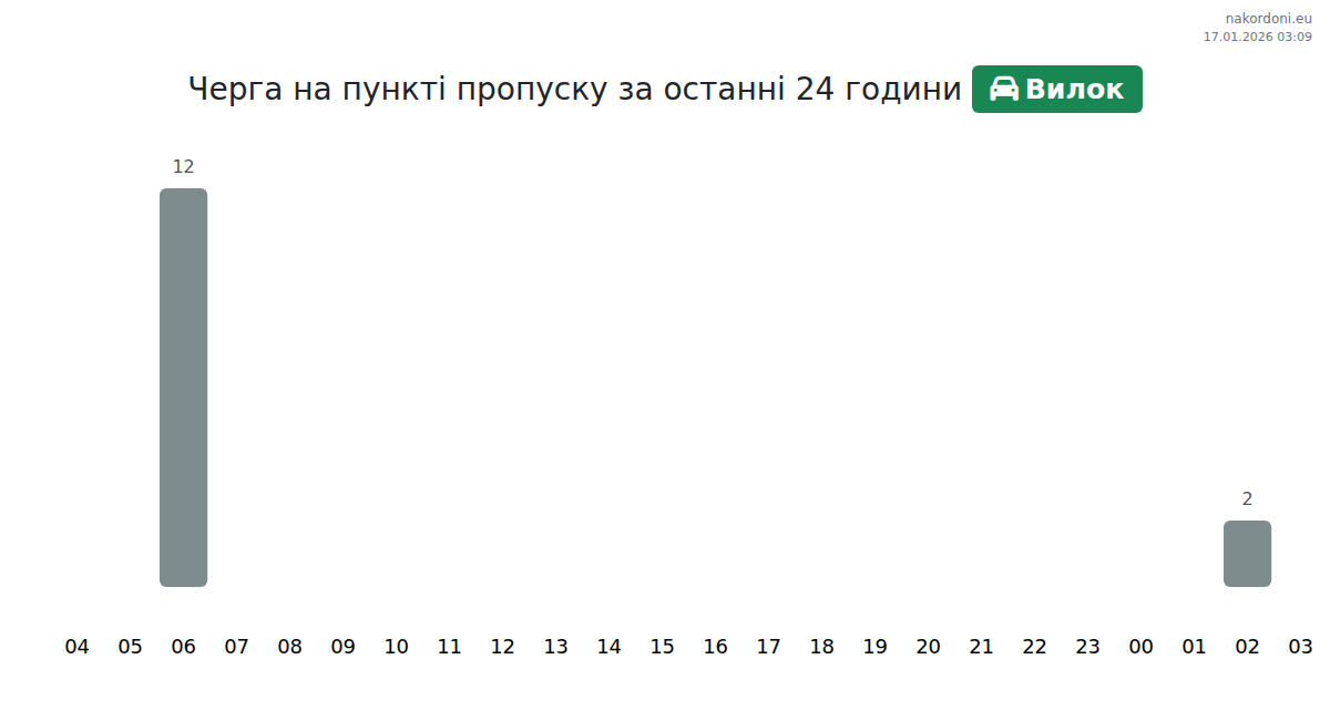 Для уникнення довгих черг на кордоні на пункті пропуску Вилок - легковий автомобіль, рекомендуємо планувати перетин кордону в години найменшого навантаження. Згідно з даними за минулу добу, найменша кількість автомобілів спостерігалася між 5:00 та 9:00 годинами. Це ідеальний час для перетину кордону, щоб зекономити час і уникнути затримок.