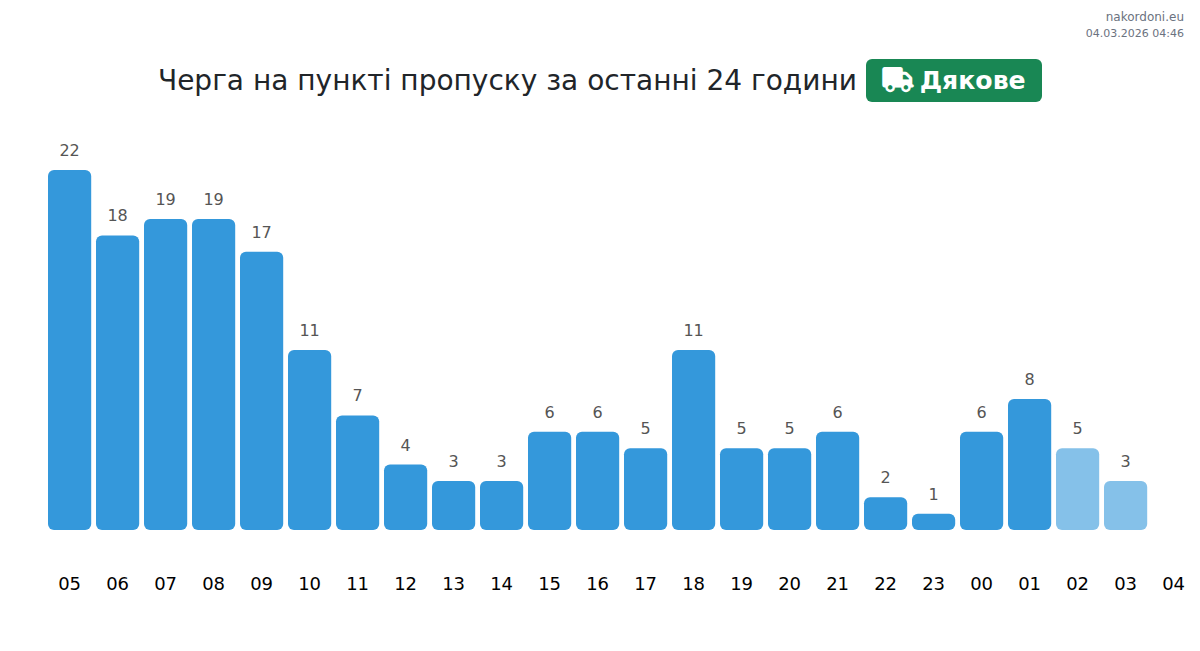 Для уникнення довгих черг на кордоні на пункті пропуску Дякове - вантажний транспорт, рекомендуємо планувати перетин кордону в години найменшого навантаження. Згідно з даними за минулу добу, найменша кількість автомобілів спостерігалася між 22:00 та 23:00 годинами. Це ідеальний час для перетину кордону, щоб зекономити час і уникнути затримок.