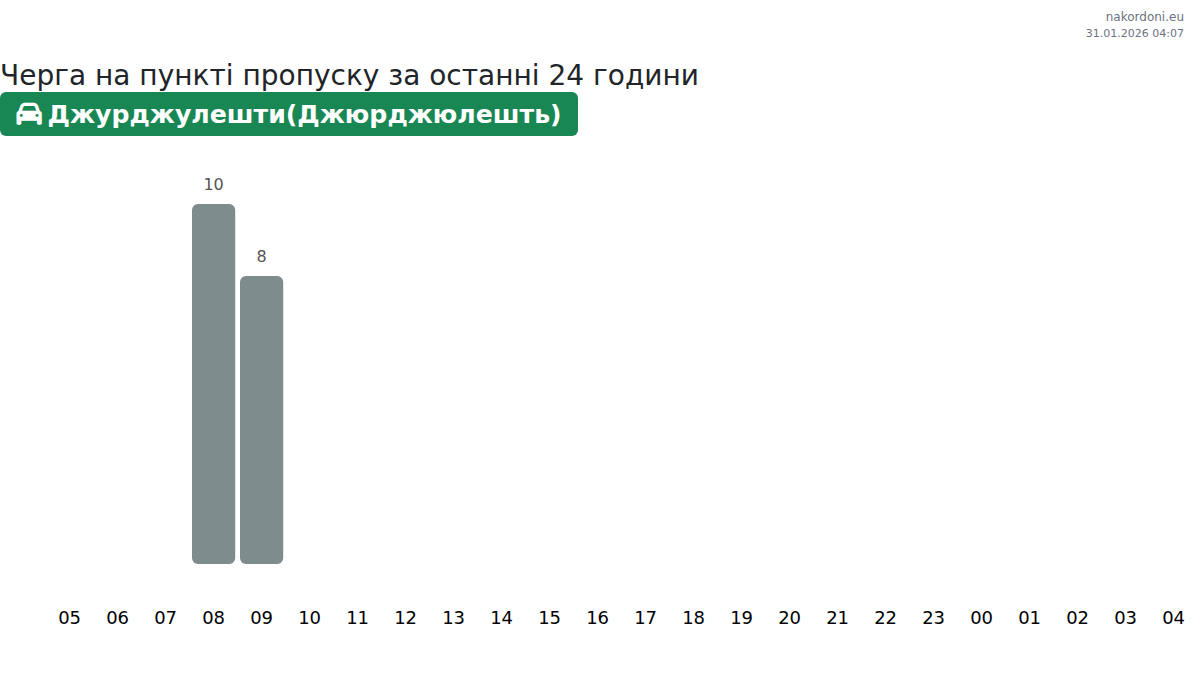 Плануйте свої поїздки заздалегідь, використовуючи актуальну інформацію про черги на кордоні на пункті пропуску Джурджулешти(Джюрджюлешть) - легковий автомобіль, щоб зробити ваш перетин швидким і зручним. Приділіть особливу увагу цим годинам, щоб уникнути пікового навантаження і зменшити час очікування.