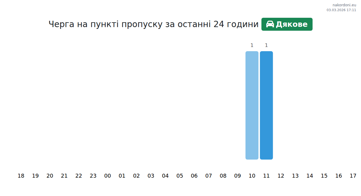 На пункті Дякове час очікування для легкових авто становить 15-51 хв. Рекомендуємо уникати пікових годин об 08:00, 11:00 та 13:00. Найшвидше пройти кордон можна о 09:00, 10:00 або 12:00.