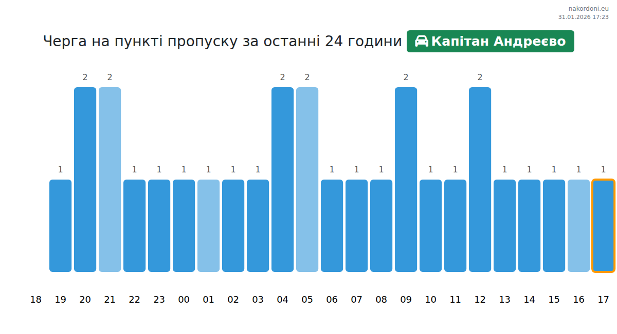 Для уникнення довгих черг на кордоні на пункті пропуску Капітан Андреєво - легковий автомобіль, рекомендуємо планувати перетин кордону в години найменшого навантаження. Згідно з даними за минулу добу, найменша кількість автомобілів спостерігалася між :00 та 1:00 годинами. Це ідеальний час для перетину кордону, щоб зекономити час і уникнути затримок.