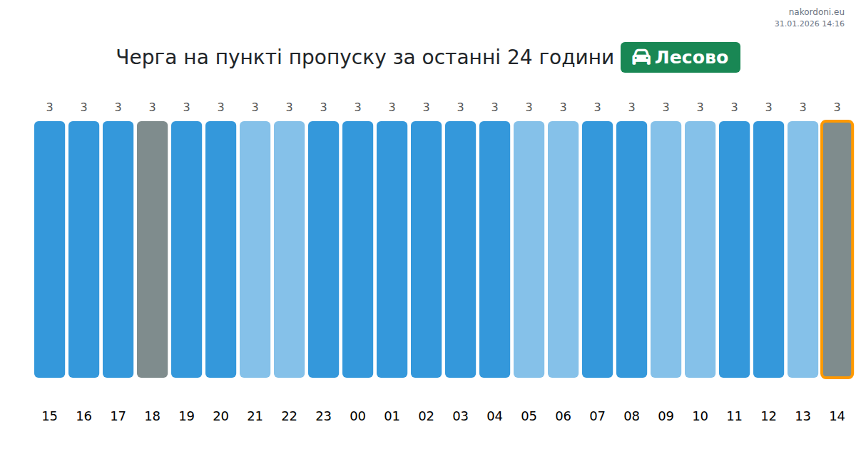 Для уникнення довгих черг на кордоні на пункті пропуску Лесово - легковий автомобіль, рекомендуємо планувати перетин кордону в години найменшого навантаження. Згідно з даними за минулу добу, найменша кількість автомобілів спостерігалася між :00 та 1:00 годинами. Це ідеальний час для перетину кордону, щоб зекономити час і уникнути затримок.