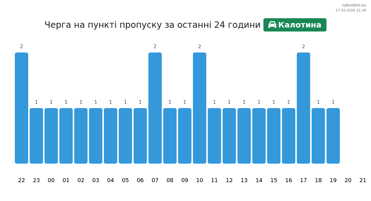 Для уникнення довгих черг на кордоні на пункті пропуску Калотина - авто, рекомендуємо планувати перетин кордону в години найменшого навантаження. Згідно з даними за минулу добу, найменша кількість автомобілів спостерігалася між :00 та 1:00 годинами. Це ідеальний час для перетину кордону, щоб зекономити час і уникнути затримок.