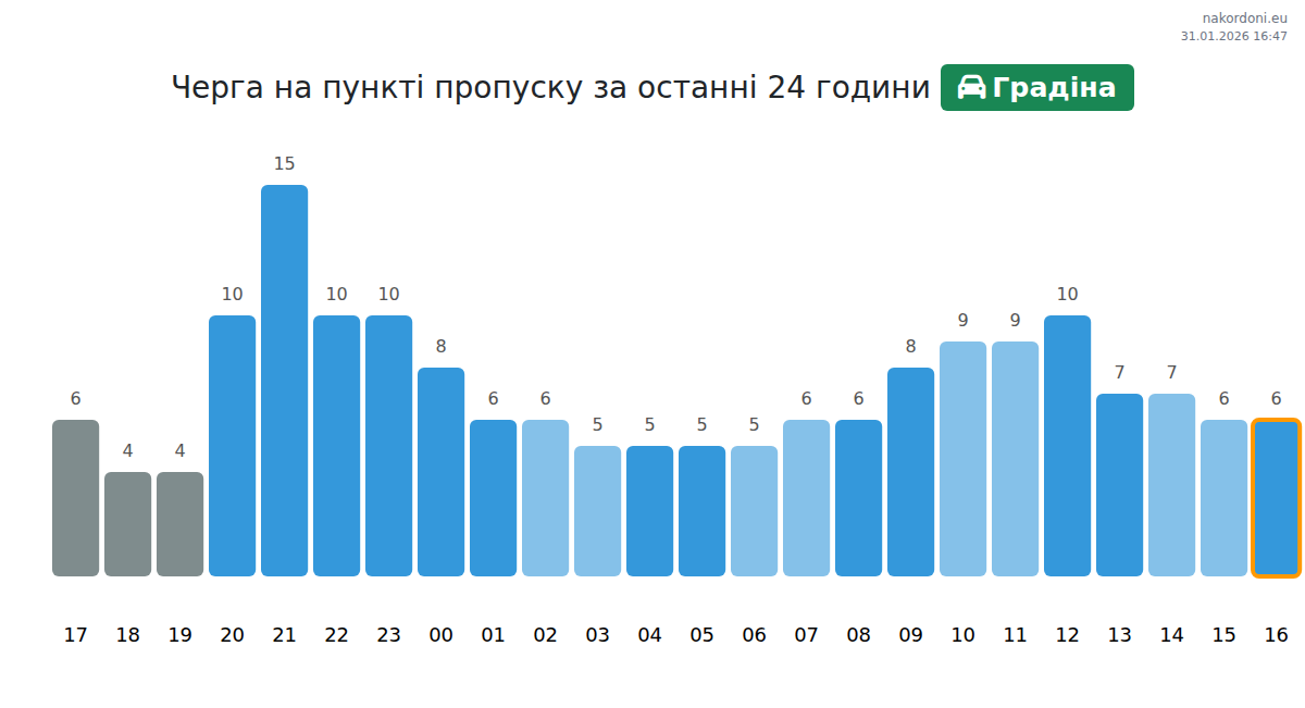 Плануйте свої поїздки заздалегідь, використовуючи актуальну інформацію про черги на кордоні на пункті пропуску Градіна - легковий автомобіль, щоб зробити ваш перетин швидким і зручним. Приділіть особливу увагу цим годинам, щоб уникнути пікового навантаження і зменшити час очікування.