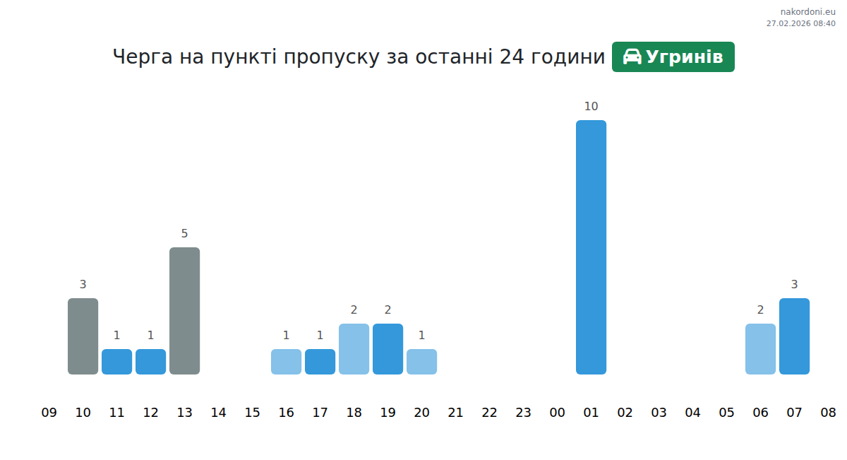 На Угринові очікується час очікування для легкових автомобілів від 15 до 87 хвилин. Рекомендується уникати годин пік: 16:00, 19:00 та 14:00. Для найкоротших черг перетинайте кордон о 00:00, 03:00 або 05:00.