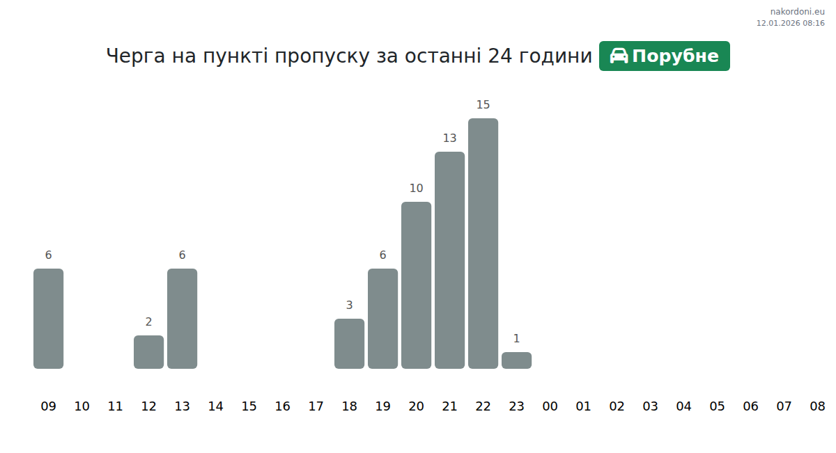 На пункті пропуску Порубне для легкових автомобілів очікуйте час очікування від 15 до 129 хвилин. Уникайте годин пікового навантаження о 04:00, 08:00 та 17:00. Найкращий час для перетину – 00:00, 05:00 та 06:00 для коротших черг.