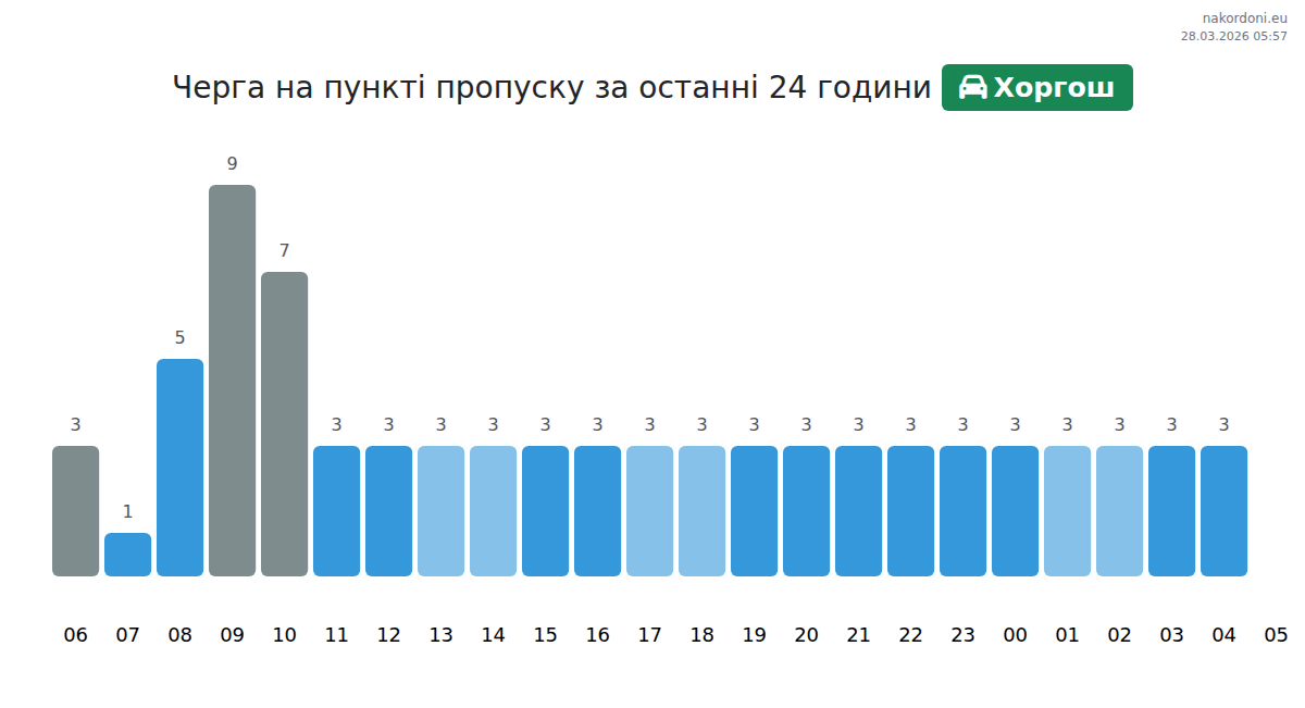 Для уникнення довгих черг на кордоні на пункті пропуску Хоргош - легковий автомобіль, рекомендуємо планувати перетин кордону в години найменшого навантаження. Згідно з даними за минулу добу, найменша кількість автомобілів спостерігалася між :00 та 4:00 годинами. Це ідеальний час для перетину кордону, щоб зекономити час і уникнути затримок.