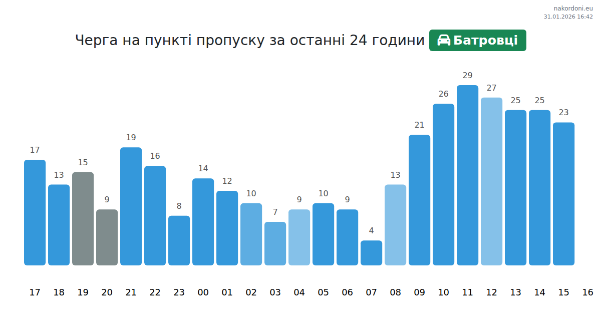 Для уникнення довгих черг на кордоні на пункті пропуску Батровці - легковий автомобіль, рекомендуємо планувати перетин кордону в години найменшого навантаження. Згідно з даними за минулу добу, найменша кількість автомобілів спостерігалася між 2:00 та 18:00 годинами. Це ідеальний час для перетину кордону, щоб зекономити час і уникнути затримок.