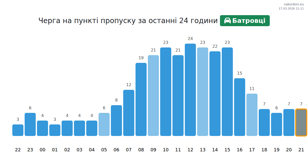 На пункті Батровці час очікування для легкових авто становить 45-195 хвилин. Рекомендуємо уникати пікових годин о 12:00, 13:00 та 09:00. Найкращий час для швидкого перетину кордону — 03:00, 02:00 або 04:00.