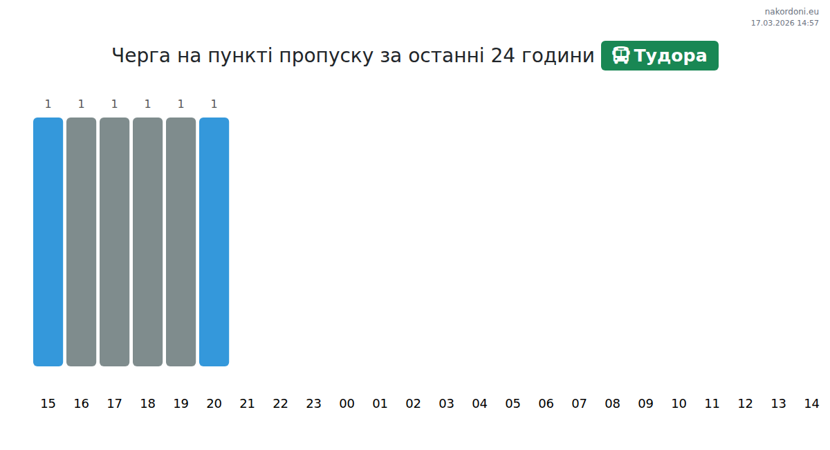 На пункті пропуску Тудора для автобусів очікуваний час становить 15-15 хвилин. Рекомендуємо уникати пікових годин (07:00, 08:00, 09:00) та планувати перетин у найкращі часові проміжки (10:00, 11:00, 12:00).