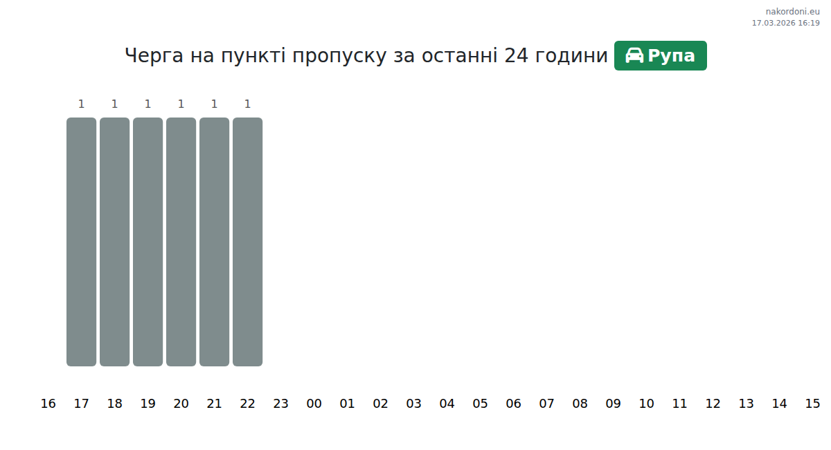 На пункті пропуску Рупа очікуваний час очікування для легкових авто становить 71-77 хвилин. Найбільші черги прогнозуються о 09:00, 12:00 та 13:00, тому радимо планувати поїздку на 14:00, 15:00 або 16:00 для швидшого перетину.