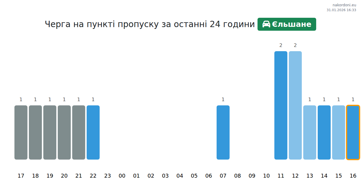 Для уникнення довгих черг на кордоні на пункті пропуску Єльшане - легковий автомобіль, рекомендуємо планувати перетин кордону в години найменшого навантаження. Згідно з даними за минулу добу, найменша кількість автомобілів спостерігалася між 7:00 та 10:00 годинами. Це ідеальний час для перетину кордону, щоб зекономити час і уникнути затримок.