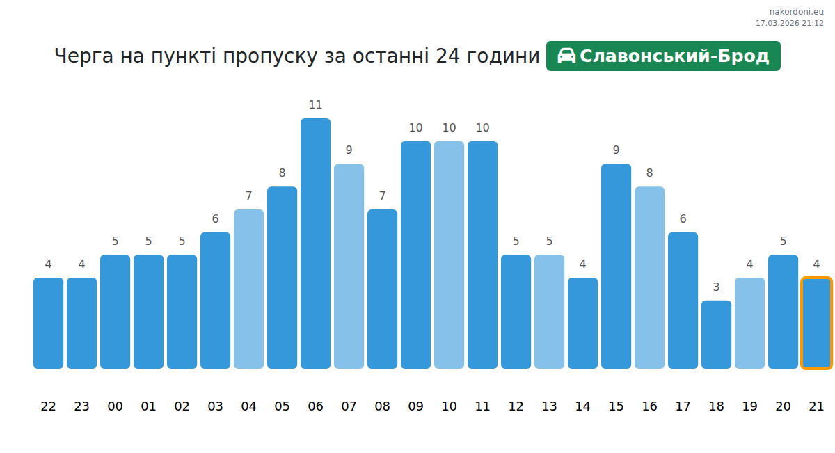 На КПП Славонський-Брод очікується черга від 89 до 125 хвилин. Рекомендуємо уникати годин пік (08:00, 10:00, 09:00), коли завантаженість найбільша. Найкращий час для перетину — після 20:00, 21:00 або 22:00.