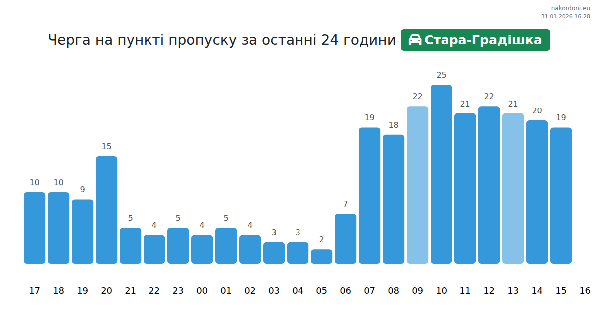 Плануйте свої поїздки заздалегідь, використовуючи актуальну інформацію про черги на кордоні на пункті пропуску Стара-Градішка - легковий автомобіль, щоб зробити ваш перетин швидким і зручним. Приділіть особливу увагу цим годинам, щоб уникнути пікового навантаження і зменшити час очікування.