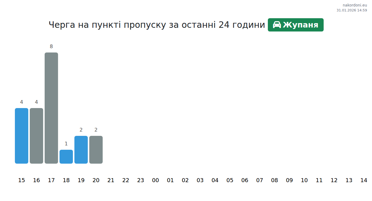 Плануйте свої поїздки заздалегідь, використовуючи актуальну інформацію про черги на кордоні на пункті пропуску Жупаня - легковий автомобіль, щоб зробити ваш перетин швидким і зручним. Приділіть особливу увагу цим годинам, щоб уникнути пікового навантаження і зменшити час очікування.