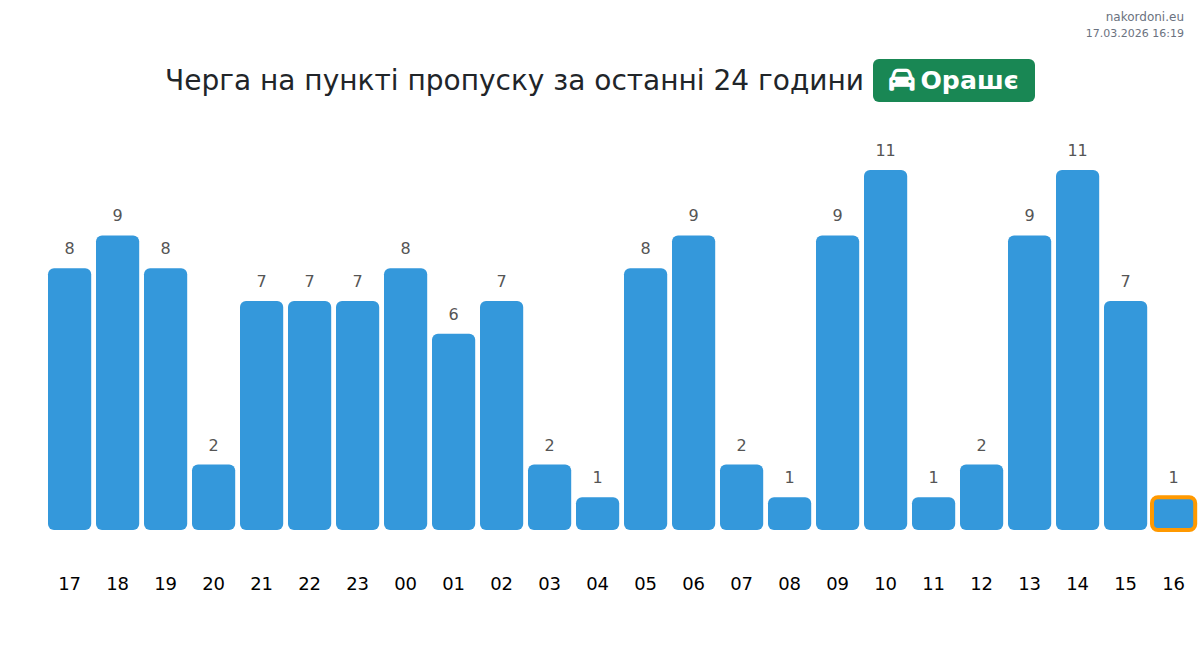 За період 16.03.2026 з 00:00 по 23:59 на кордоні на пункті пропуску Орашє - авто були зафіксовані наступні ключові моменти: