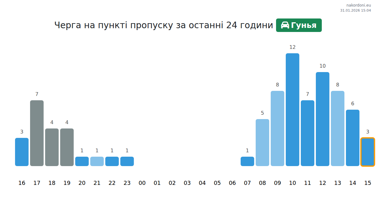 Для уникнення довгих черг на кордоні на пункті пропуску Гунья - легковий автомобіль, рекомендуємо планувати перетин кордону в години найменшого навантаження. Згідно з даними за минулу добу, найменша кількість автомобілів спостерігалася між 1:00 та 20:00 годинами. Це ідеальний час для перетину кордону, щоб зекономити час і уникнути затримок.