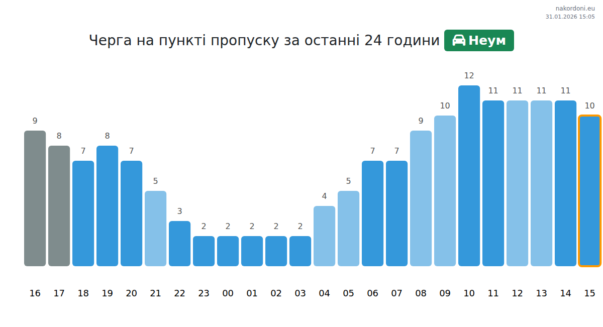 Плануйте свої поїздки заздалегідь, використовуючи актуальну інформацію про черги на кордоні на пункті пропуску Неум - легковий автомобіль, щоб зробити ваш перетин швидким і зручним. Приділіть особливу увагу цим годинам, щоб уникнути пікового навантаження і зменшити час очікування.