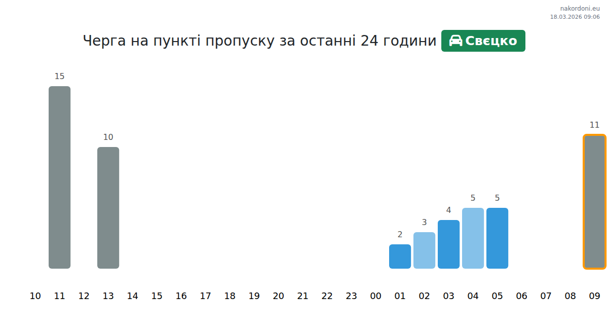Для уникнення довгих черг на кордоні на пункті пропуску Свєцко - легковий автомобіль, рекомендуємо планувати перетин кордону в години найменшого навантаження. Згідно з даними за минулу добу, найменша кількість автомобілів спостерігалася між 3:00 та 5:00 годинами. Це ідеальний час для перетину кордону, щоб зекономити час і уникнути затримок.