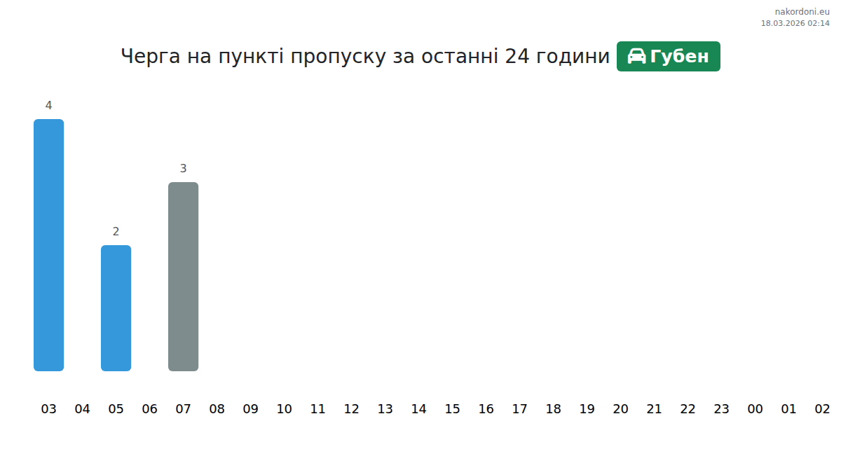 Для уникнення довгих черг на кордоні на пункті пропуску Губен - легковий автомобіль TaxFREE (Червона лінія), рекомендуємо планувати перетин кордону в години найменшого навантаження. Згідно з даними за минулу добу, найменша кількість автомобілів спостерігалася між 1:00 та 5:00 годинами. Це ідеальний час для перетину кордону, щоб зекономити час і уникнути затримок.