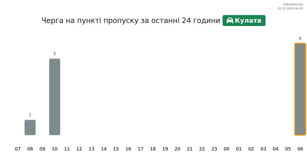 Для уникнення довгих черг на кордоні на пункті пропуску Кулата - легковий автомобіль, рекомендуємо планувати перетин кордону в години найменшого навантаження. Згідно з даними за минулу добу, найменша кількість автомобілів спостерігалася між 14:00 та 20:00 годинами. Це ідеальний час для перетину кордону, щоб зекономити час і уникнути затримок.
