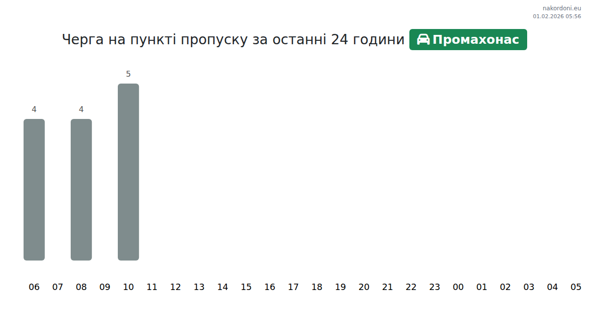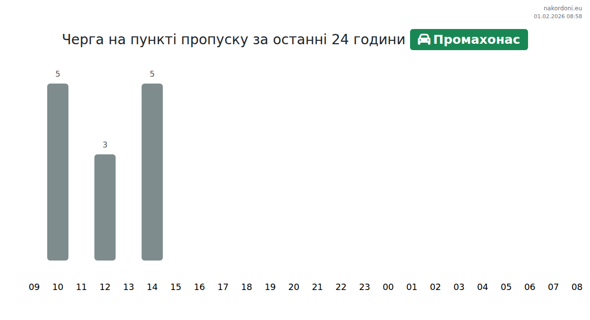 На пункті пропуску Промахонас час очікування для легкових авто становить 30-66 хвилин. Пікові години навантаження припадають на 06:00, 08:00 та 12:00. Найкраще планувати поїздку на 01:00, 03:00 або 05:00 для швидкого перетину.