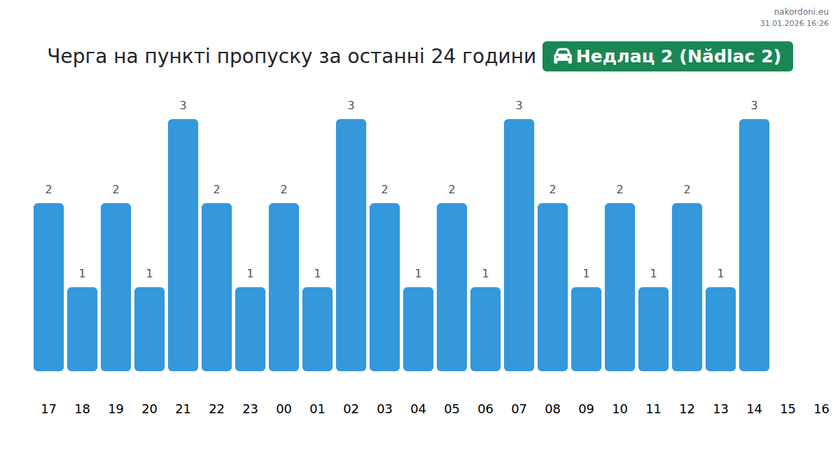 Для уникнення довгих черг на кордоні на пункті пропуску Недлац 2 (Nădlac 2) - легковий автомобіль, рекомендуємо планувати перетин кордону в години найменшого навантаження. Згідно з даними за минулу добу, найменша кількість автомобілів спостерігалася між 2:00 та 4:00 годинами. Це ідеальний час для перетину кордону, щоб зекономити час і уникнути затримок.