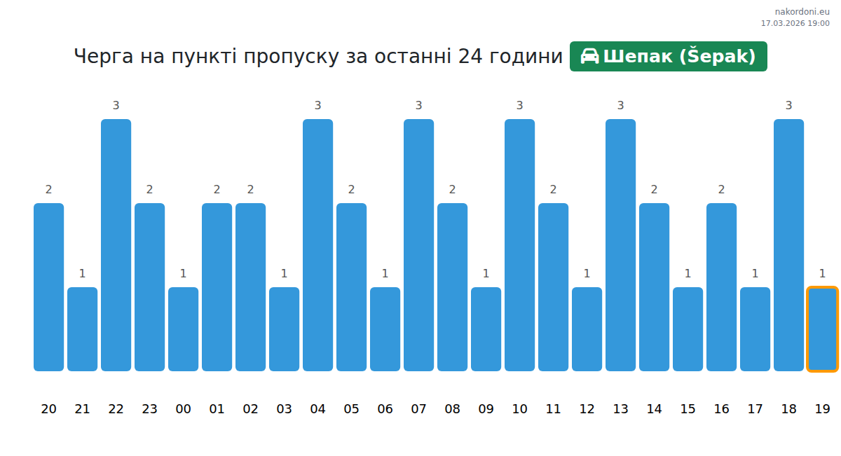 Для уникнення довгих черг на кордоні на пункті пропуску Шепак (Šepak) - авто, рекомендуємо планувати перетин кордону в години найменшого навантаження. Згідно з даними за минулу добу, найменша кількість автомобілів спостерігалася між 2:00 та 4:00 годинами. Це ідеальний час для перетину кордону, щоб зекономити час і уникнути затримок.