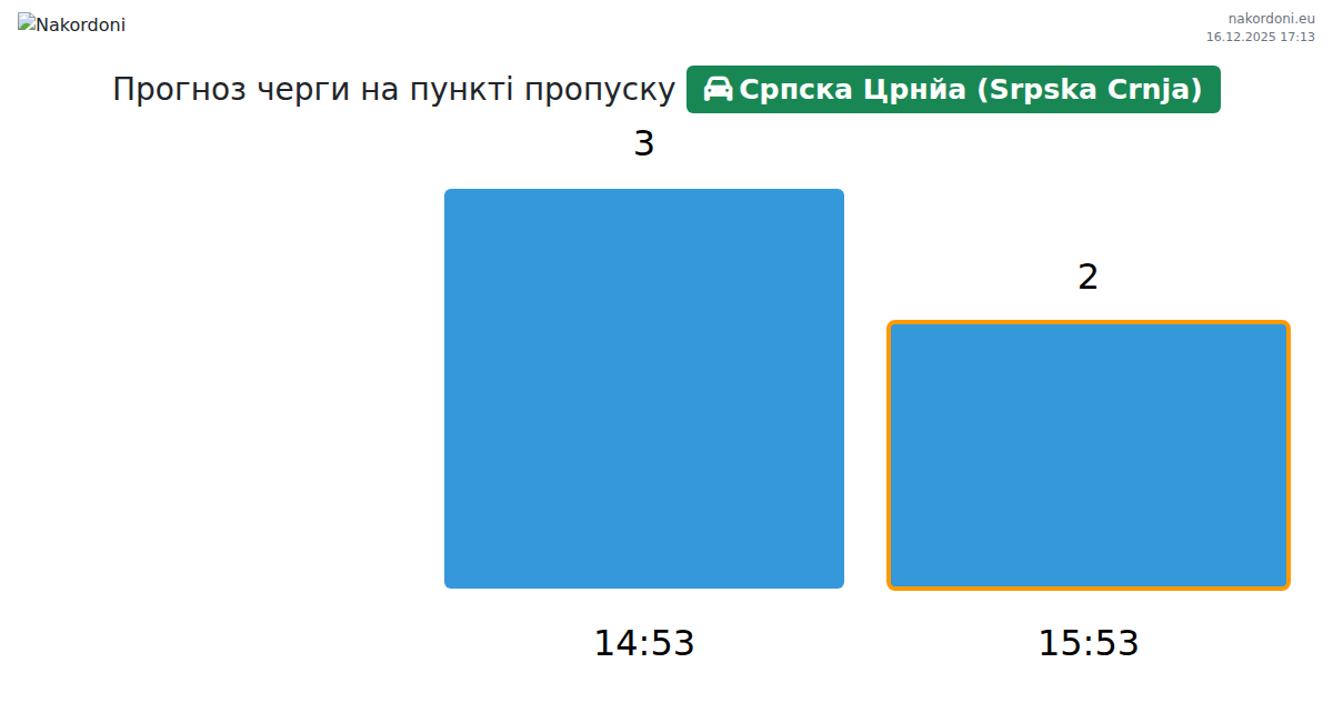 За період 15.12.2025 з 00:00 по 23:59 на кордоні на пункті пропуску Српска Црнйа (Srpska Crnja) - легковий автомобіль були зафіксовані наступні ключові моменти: