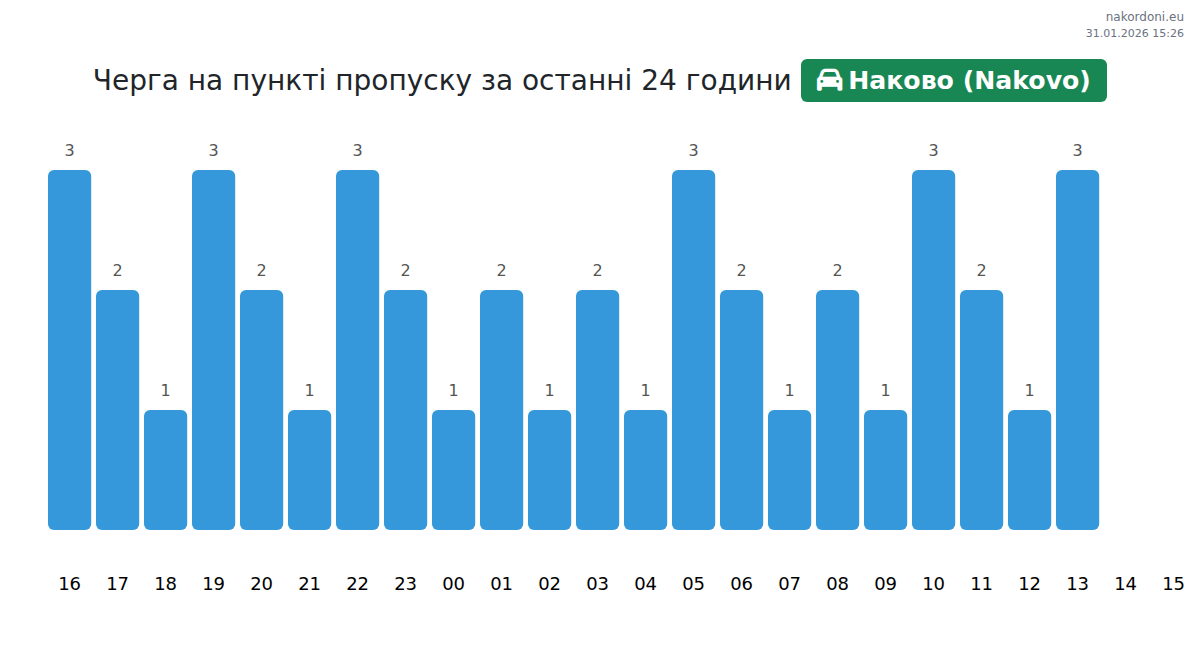 Для уникнення довгих черг на кордоні на пункті пропуску Наково (Nakovo) - легковий автомобіль, рекомендуємо планувати перетин кордону в години найменшого навантаження. Згідно з даними за минулу добу, найменша кількість автомобілів спостерігалася між 2:00 та 4:00 годинами. Це ідеальний час для перетину кордону, щоб зекономити час і уникнути затримок.