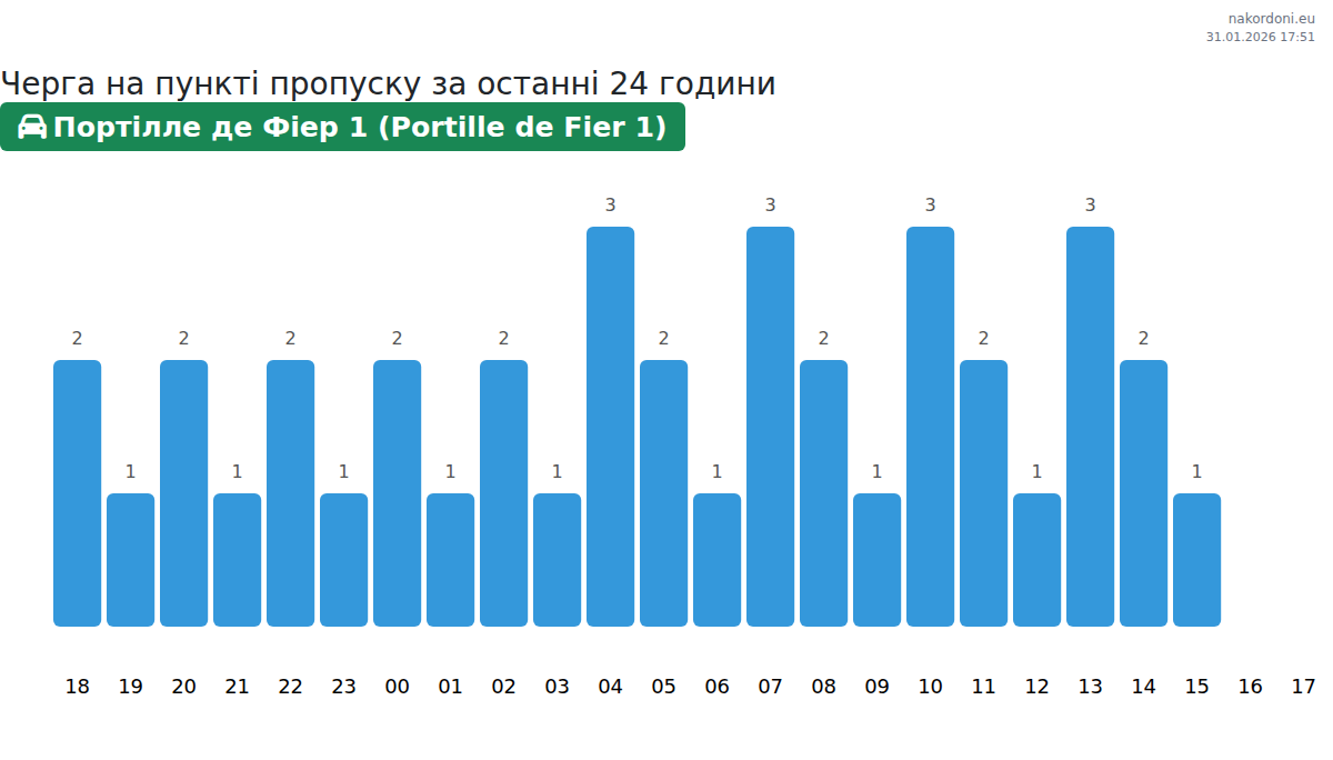 Для уникнення довгих черг на кордоні на пункті пропуску Портілле де Фіер 1 (Portille de Fier 1) - легковий автомобіль, рекомендуємо планувати перетин кордону в години найменшого навантаження. Згідно з даними за минулу добу, найменша кількість автомобілів спостерігалася між 1:00 та 4:00 годинами. Це ідеальний час для перетину кордону, щоб зекономити час і уникнути затримок.