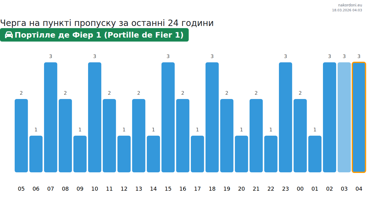 Для уникнення довгих черг на кордоні на пункті пропуску Портілле де Фіер 1 (Portille de Fier 1) - легковий автомобіль, рекомендуємо планувати перетин кордону в години найменшого навантаження. Згідно з даними за минулу добу, найменша кількість автомобілів спостерігалася між 1:00 та 3:00 годинами. Це ідеальний час для перетину кордону, щоб зекономити час і уникнути затримок.