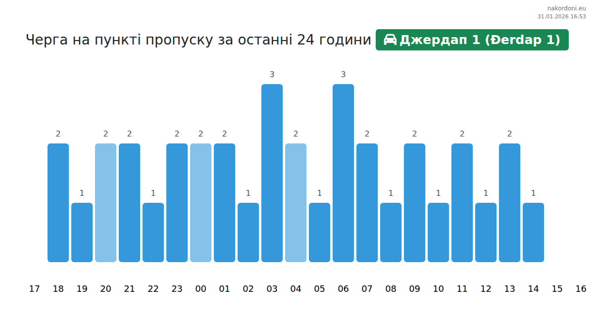 Для уникнення довгих черг на кордоні на пункті пропуску Джердап 1 (Đerdap 1) - легковий автомобіль, рекомендуємо планувати перетин кордону в години найменшого навантаження. Згідно з даними за минулу добу, найменша кількість автомобілів спостерігалася між 1:00 та 4:00 годинами. Це ідеальний час для перетину кордону, щоб зекономити час і уникнути затримок.