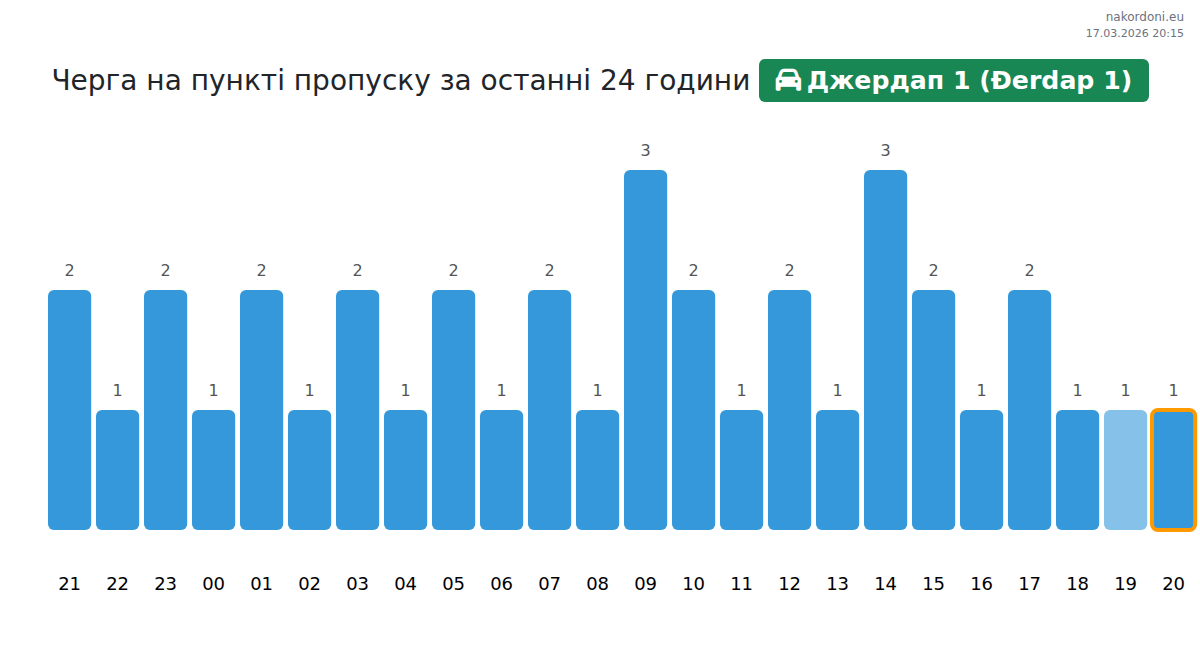Для уникнення довгих черг на кордоні на пункті пропуску Джердап 1 (Đerdap 1) - авто, рекомендуємо планувати перетин кордону в години найменшого навантаження. Згідно з даними за минулу добу, найменша кількість автомобілів спостерігалася між 2:00 та 5:00 годинами. Це ідеальний час для перетину кордону, щоб зекономити час і уникнути затримок.