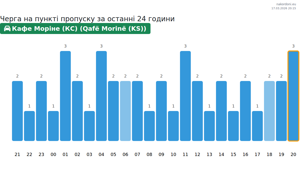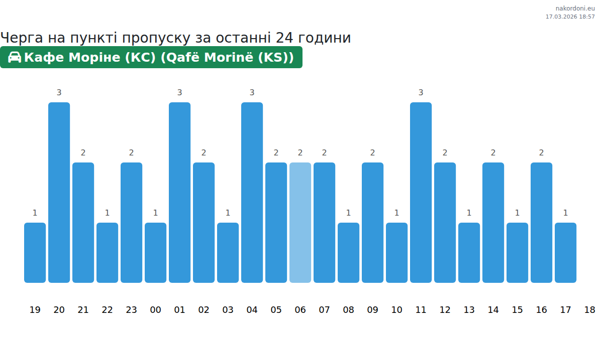 Для уникнення довгих черг на кордоні на пункті пропуску Кафе Моріне (КС) (Qafë Morinë (KS)) - авто, рекомендуємо планувати перетин кордону в години найменшого навантаження. Згідно з даними за минулу добу, найменша кількість автомобілів спостерігалася між 2:00 та 5:00 годинами. Це ідеальний час для перетину кордону, щоб зекономити час і уникнути затримок.