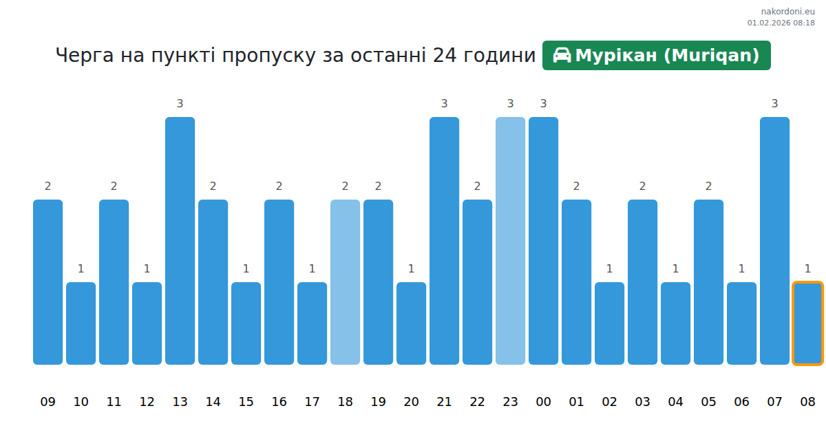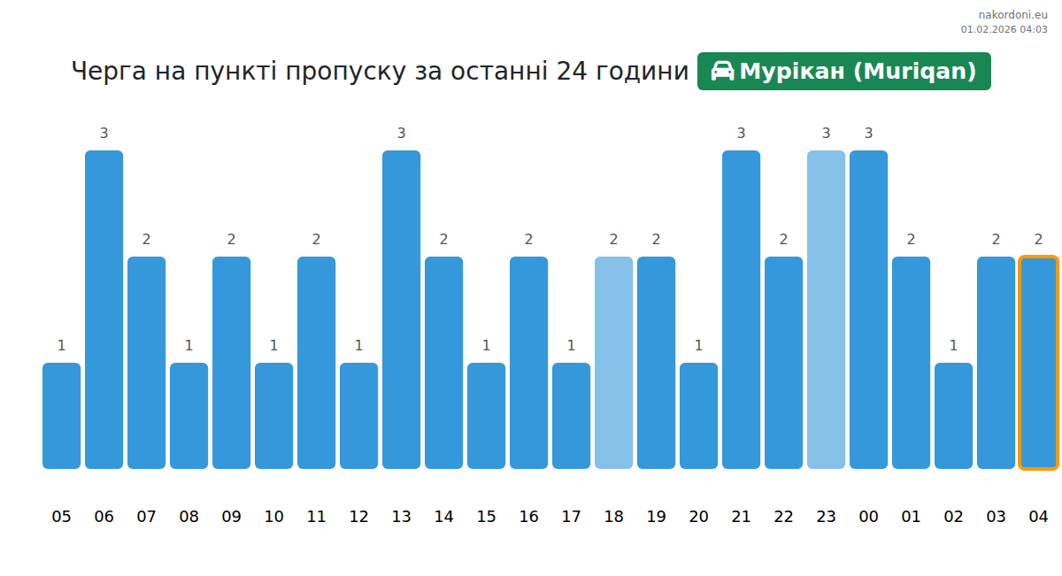 Для уникнення довгих черг на кордоні на пункті пропуску Мурікан (Muriqan) - легковий автомобіль, рекомендуємо планувати перетин кордону в години найменшого навантаження. Згідно з даними за минулу добу, найменша кількість автомобілів спостерігалася між 1:00 та 3:00 годинами. Це ідеальний час для перетину кордону, щоб зекономити час і уникнути затримок.