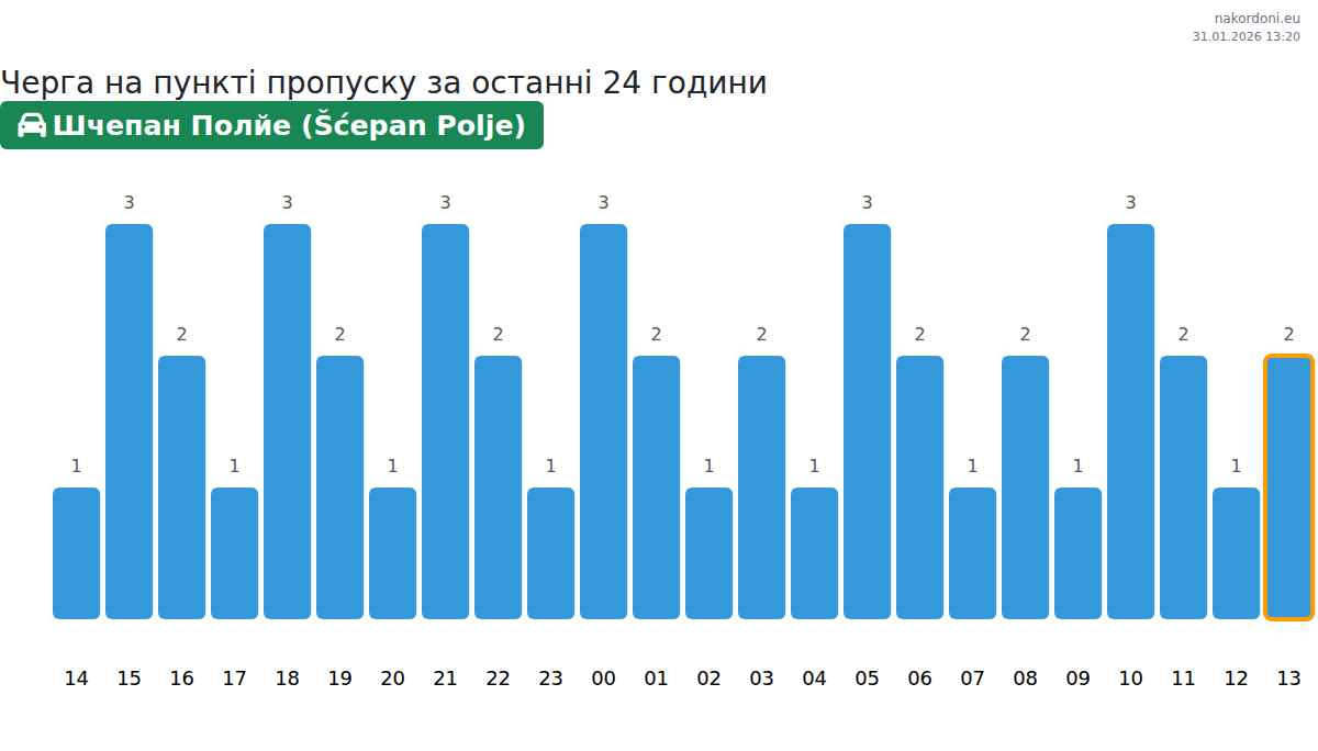 Для уникнення довгих черг на кордоні на пункті пропуску Шчепан Полйе (Šćepan Polje) - легковий автомобіль, рекомендуємо планувати перетин кордону в години найменшого навантаження. Згідно з даними за минулу добу, найменша кількість автомобілів спостерігалася між :00 та 2:00 годинами. Це ідеальний час для перетину кордону, щоб зекономити час і уникнути затримок.